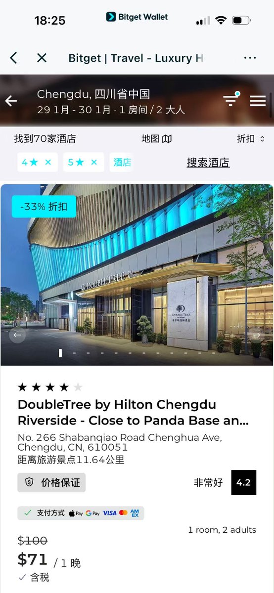 因为U卡都是国际卡,所以我之前最大的痛点是超过200人民币就要被支付宝微信这些第三方渠道收3%的手续费,U卡只能被迫局限在小额支付了,但是Bitget钱包这次把U卡的消费场景打的更透了,首页改版升级后直接专门放了一个Pay板块,可以直接在里面用U定酒店,非但不需要再被渠道商收3%的手续费了,而且几乎全部酒店都有10%到30%的折扣,如下图所示,同样的酒店,71U折合493人民币,而携程是579,很香啊这一下子把U卡天花板又抬高了。