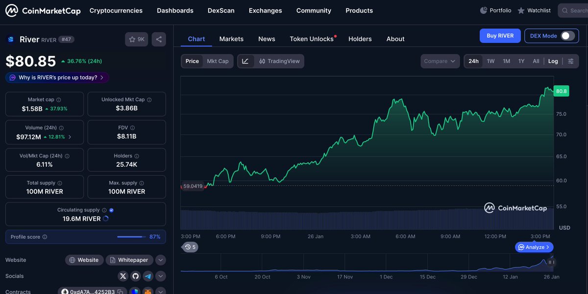 好了 $river 到80美元了,之前40u抄底的人赚翻,再也不会有人骂我: