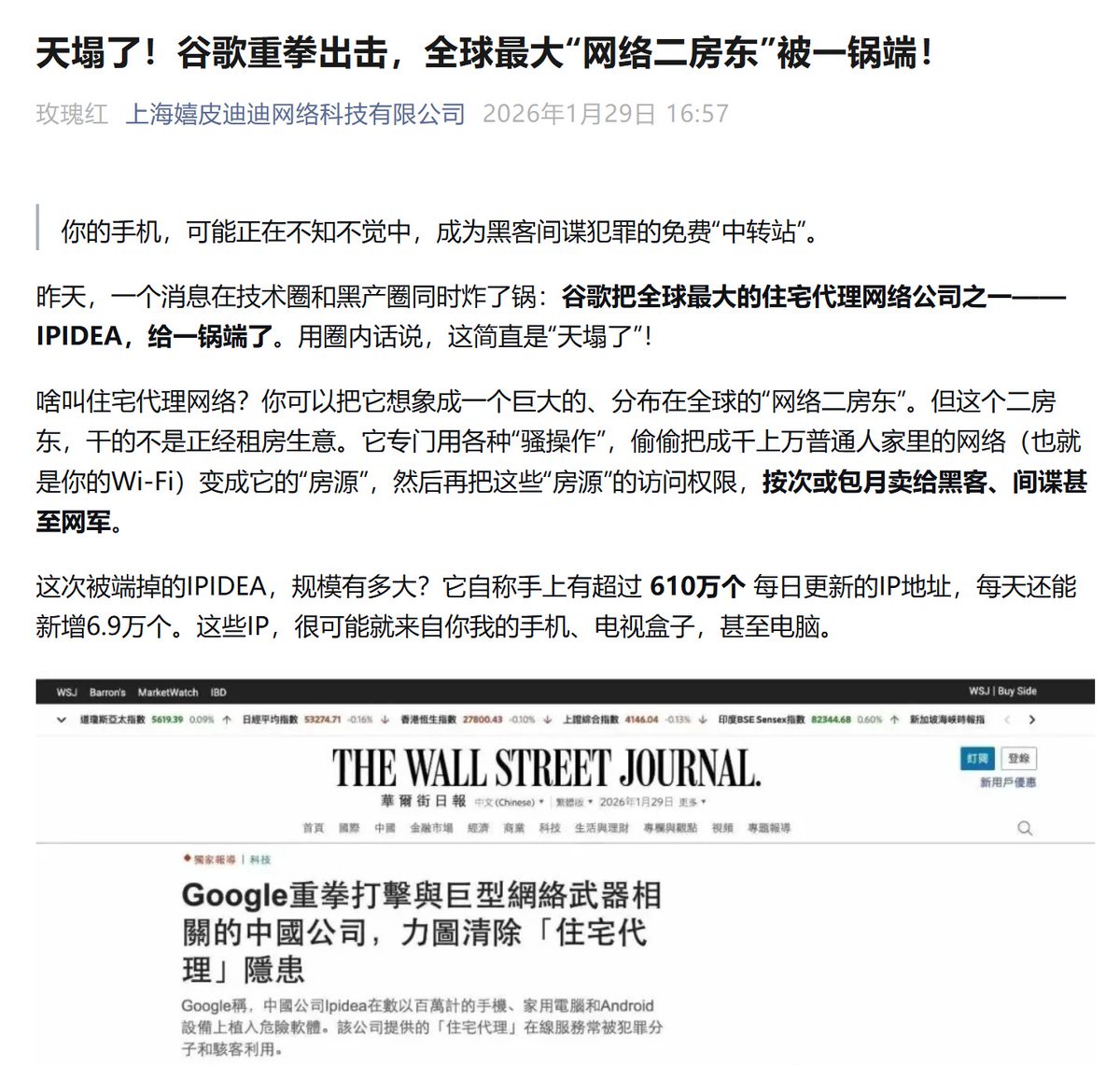最近刷到了Ipidea的事情,全球最大的住宅IP代理商被谷歌端了,它们将普通用户的住宅IP包月或者按次黑客或者网军...