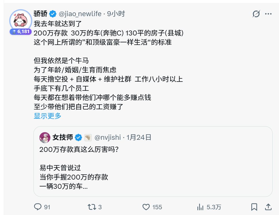 我下午随手发的"200万存款,30万车.....” 的牛马帖子,91评论,155赞,5.3万评论。