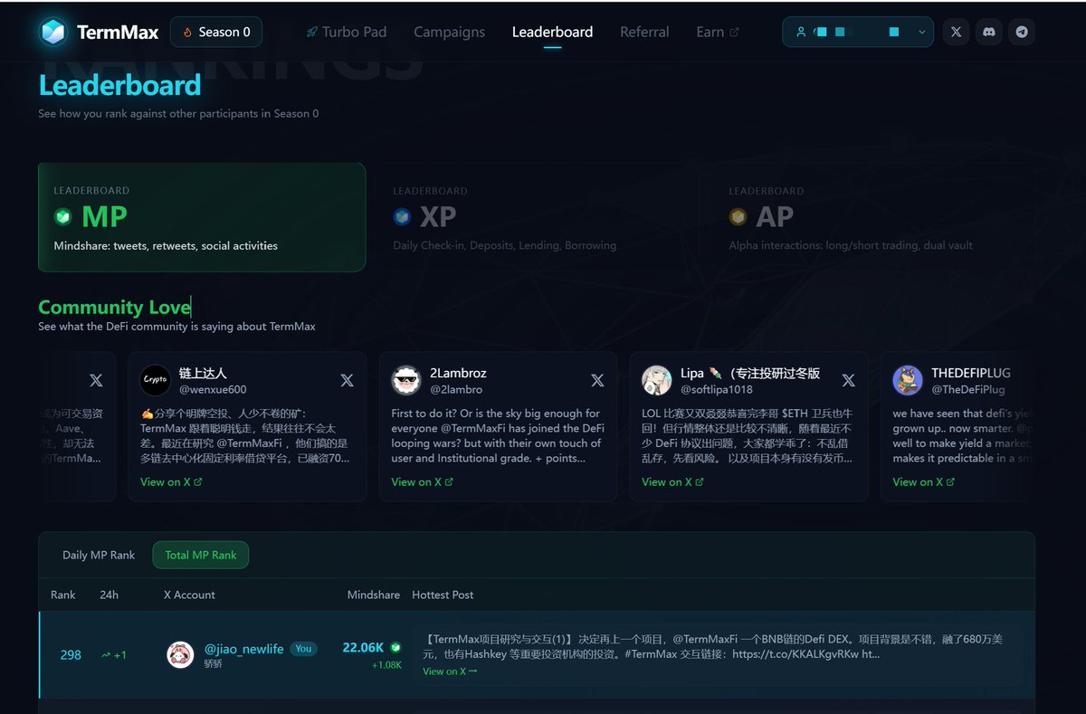 咱们来客观分析 @TermMaxFi 的收益,首先从Kaito结束后,有一些项目还可以继续去嘴撸,但是收益肯定不如Kaito。 #TermMax 只聊MP的积分的话,我预估排名靠前能到大几百U的收益,后面的人大概率是几十U打发了。