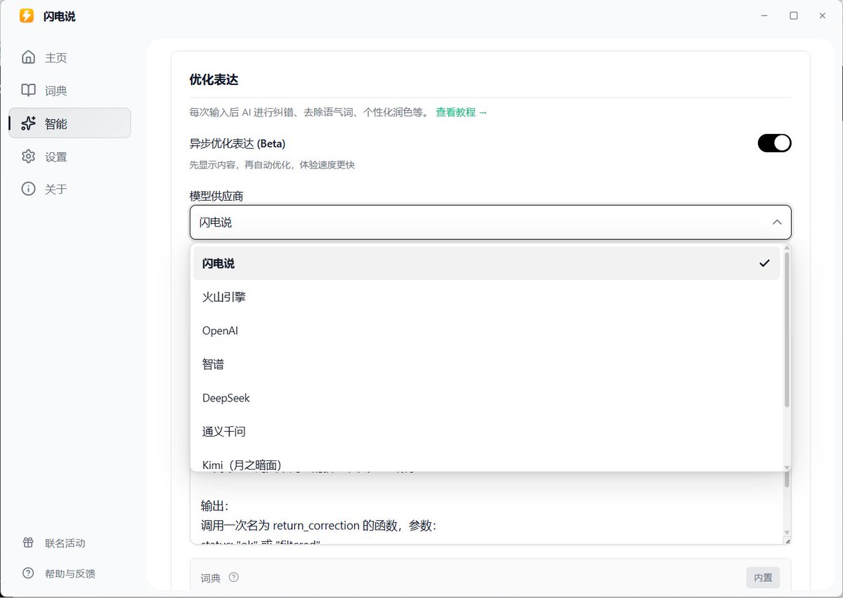 (b) 特点:支持各种第三方大模型,不像上面的产品都没啥自主选择权。而且我特别喜欢闪电说用鼠标滚轮触发语音开关的设置,这样就可以彻底解放左手了。进行长时间的语音输入时,我可以右手拿着鼠标离开电脑,这个说不清,用了才知道爽。