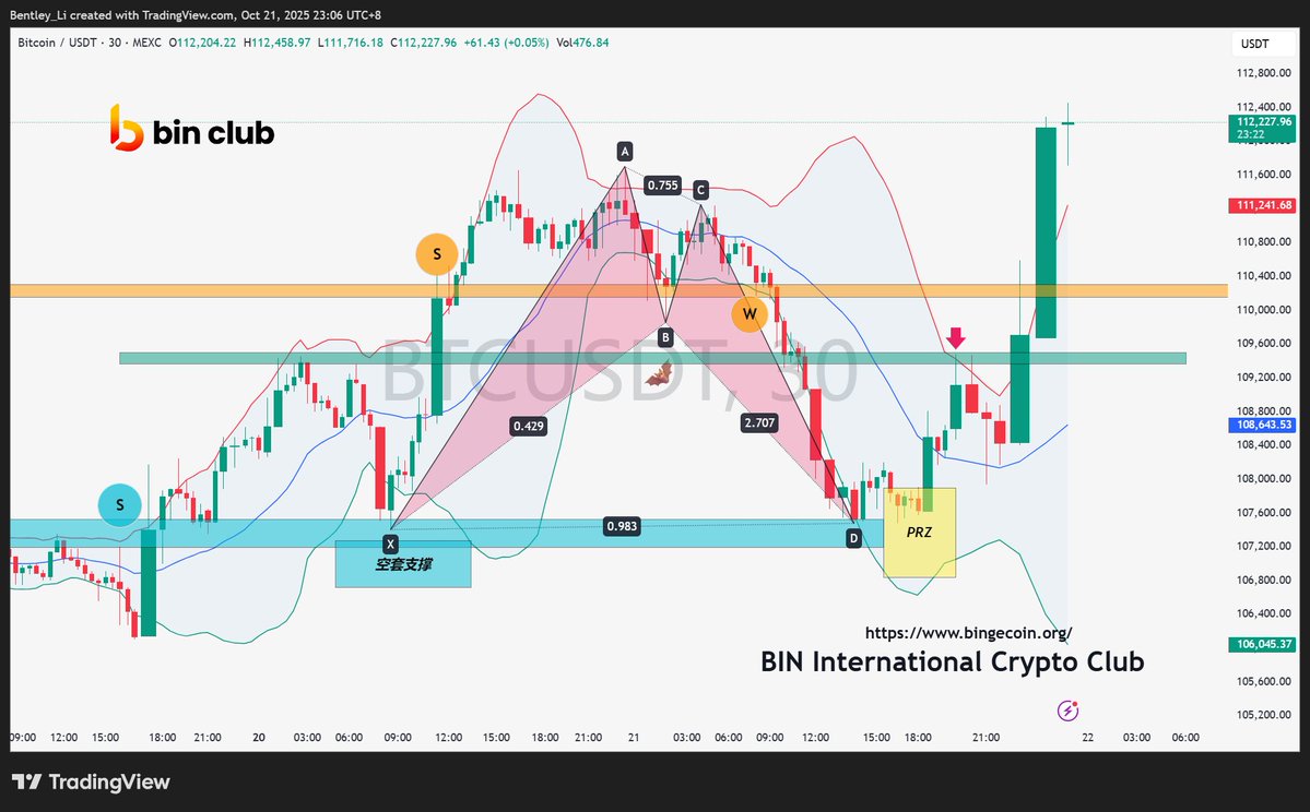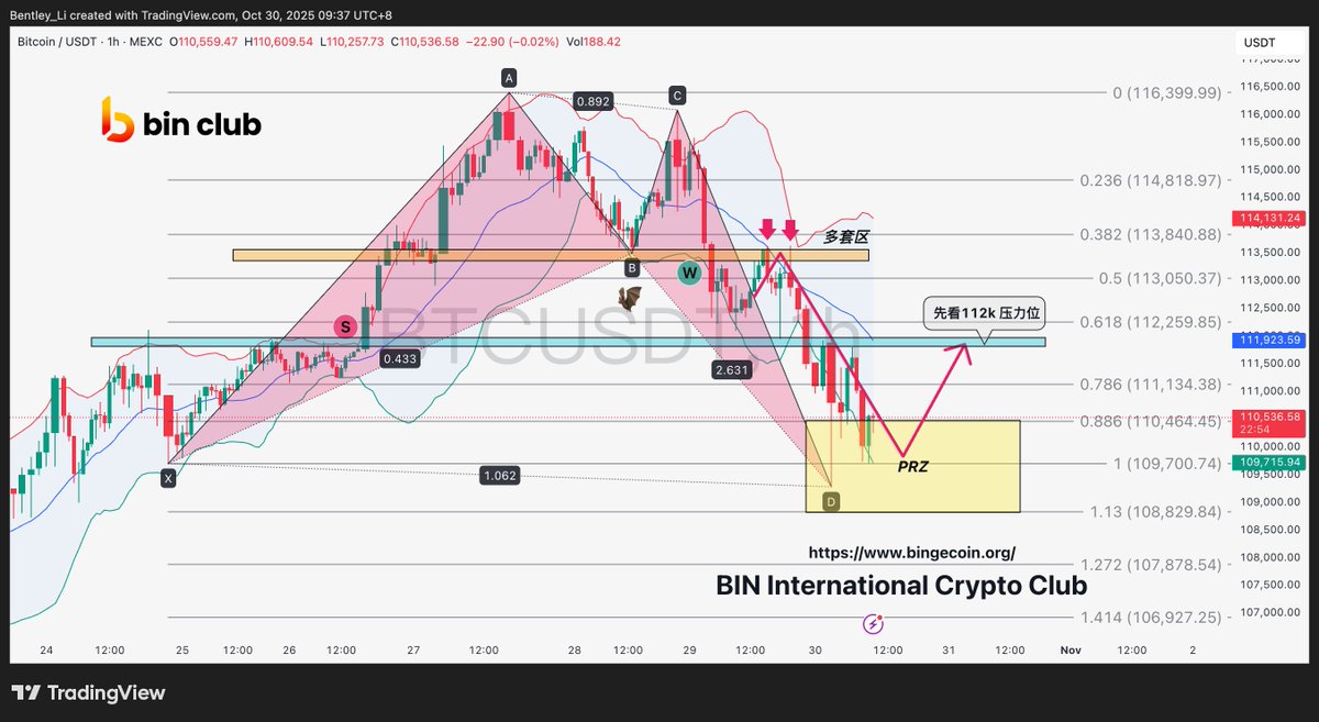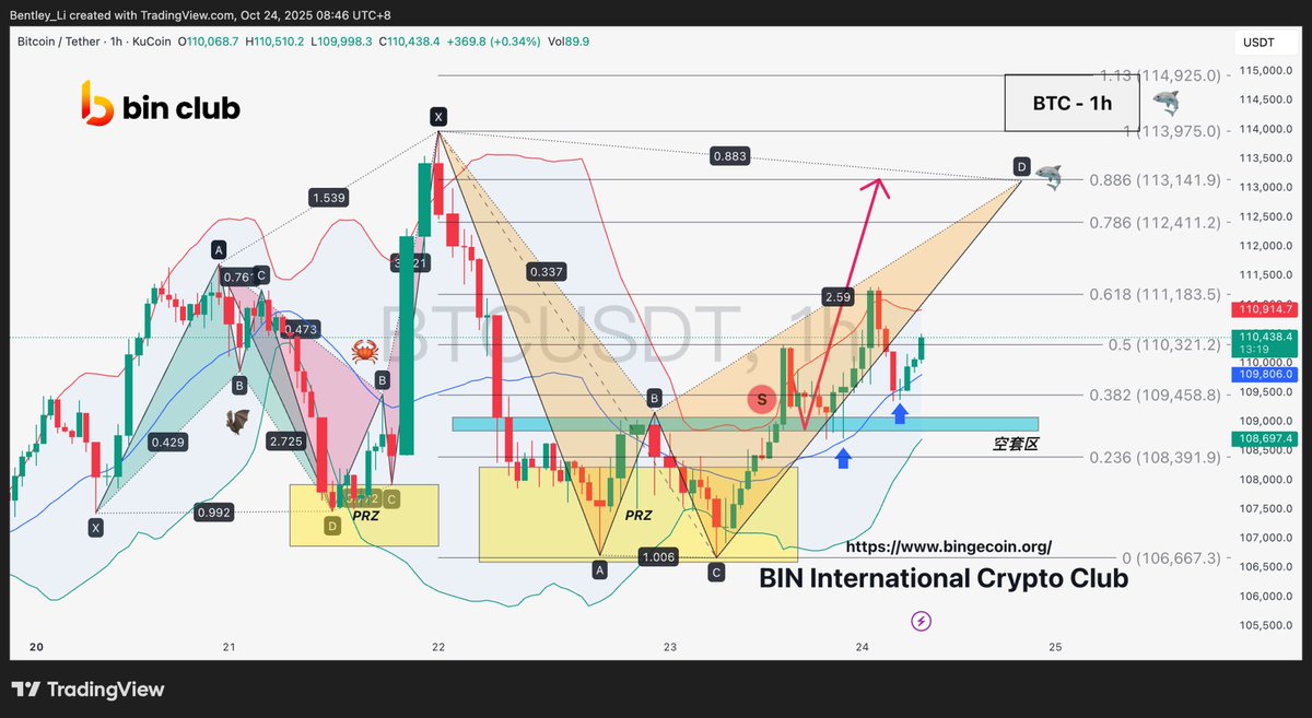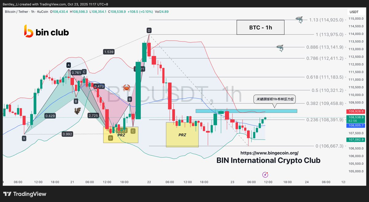 #BTC 大家早安,饼子夜里二次探底,还是没有跌破PRZ区间,目前关键看109k附近的1h布林关键压力位,如果无法突破,还有三探的机会,突破站稳的话,可以看到鲨鱼形态的113k-115k附近,明晚发布CPI关键数据,目前x普的操作还是继续制造FUD逼散户下车,看懂的点赞回复1