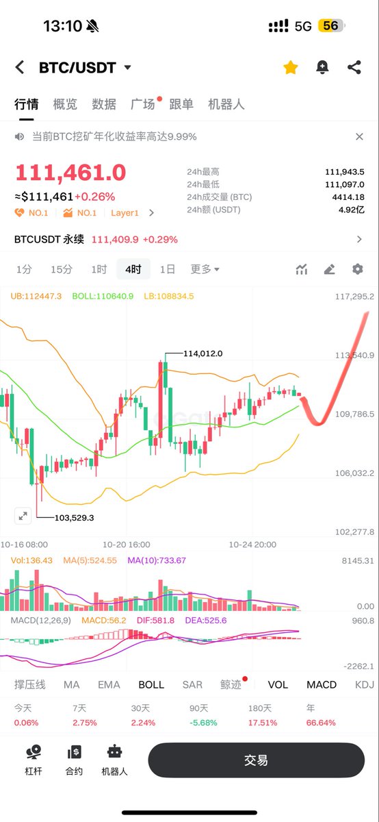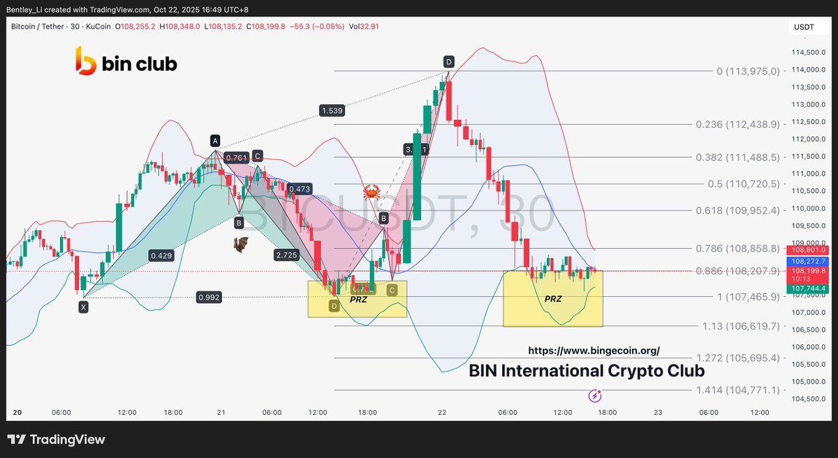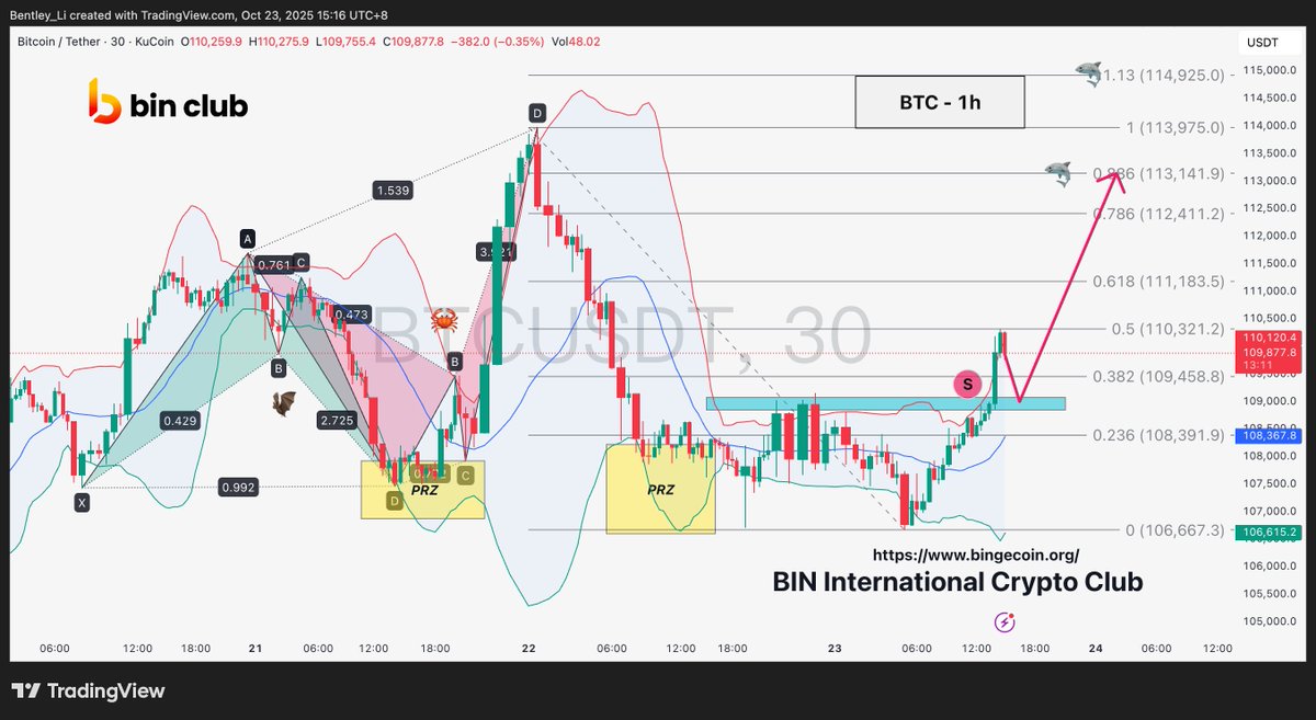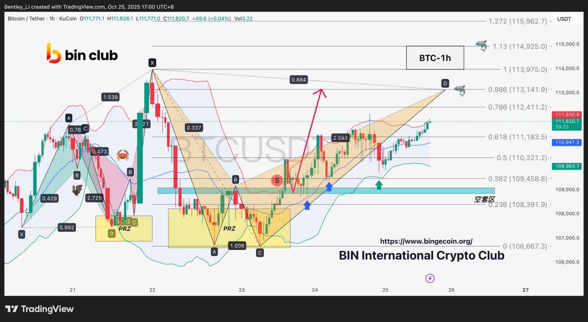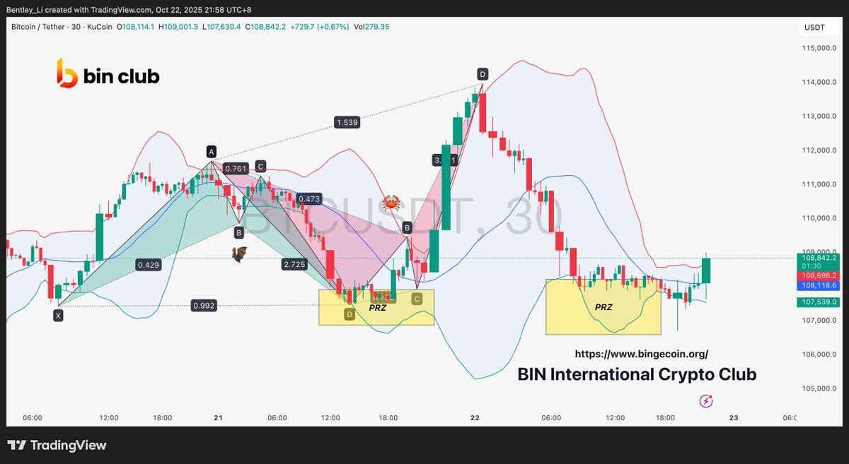 #BTC 大家早安,饼子夜里二次探底,还是没有跌破PRZ区间,目前关键看109k附近的1h布林关键压力位,如果无法突破,还有三探的机会,突破站稳的话,可以看到鲨鱼形态的113k-115k附近,明晚发布CPI关键数据,目前x普的操作还是继续制造FUD逼散户下车,看懂的点赞回复1