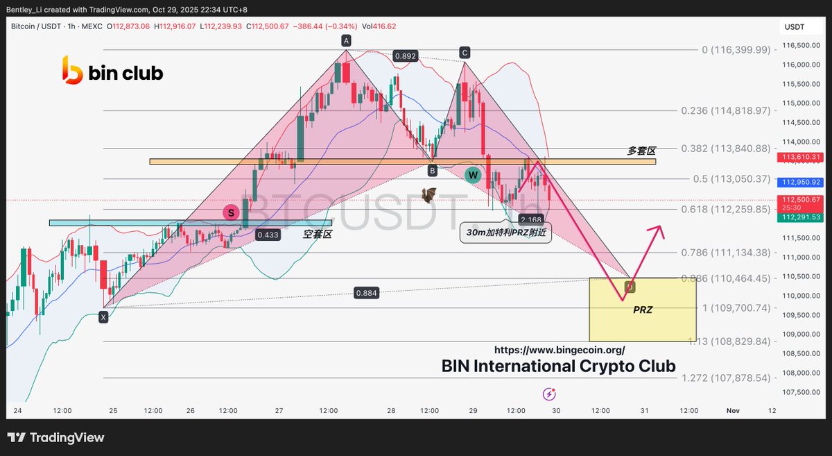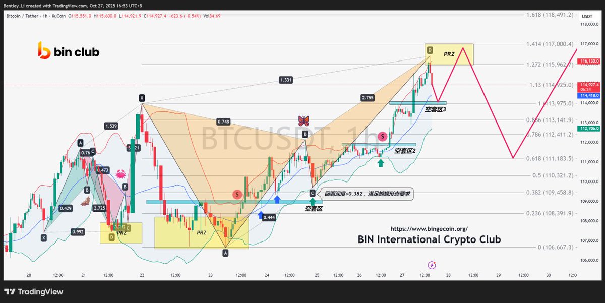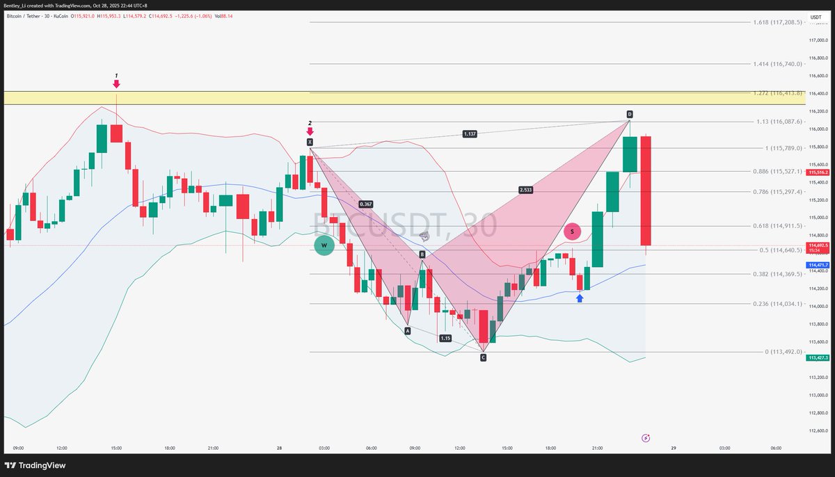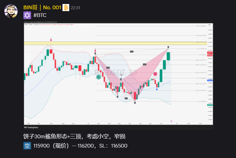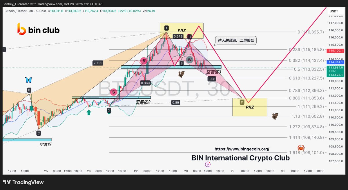 #BTC 饼子基本如预期,双顶后回调,只不过二顶略低一点,打到了30m布林上轨附近;目前重点关注空套区3的支撑,113500跌破的话谐波成立,可以考虑反抽试空,具体策略欢迎来社区参看(尤其是止损位置,不方便公开) 🧧 BIN哥铁粉可以三连后,直接点击链接进社区(限时发放):