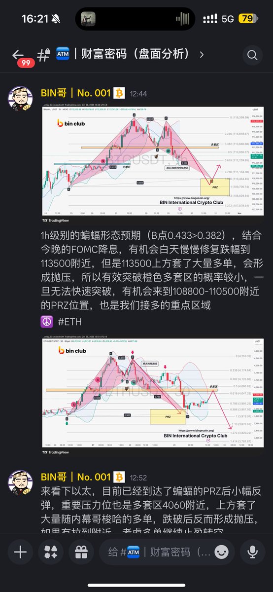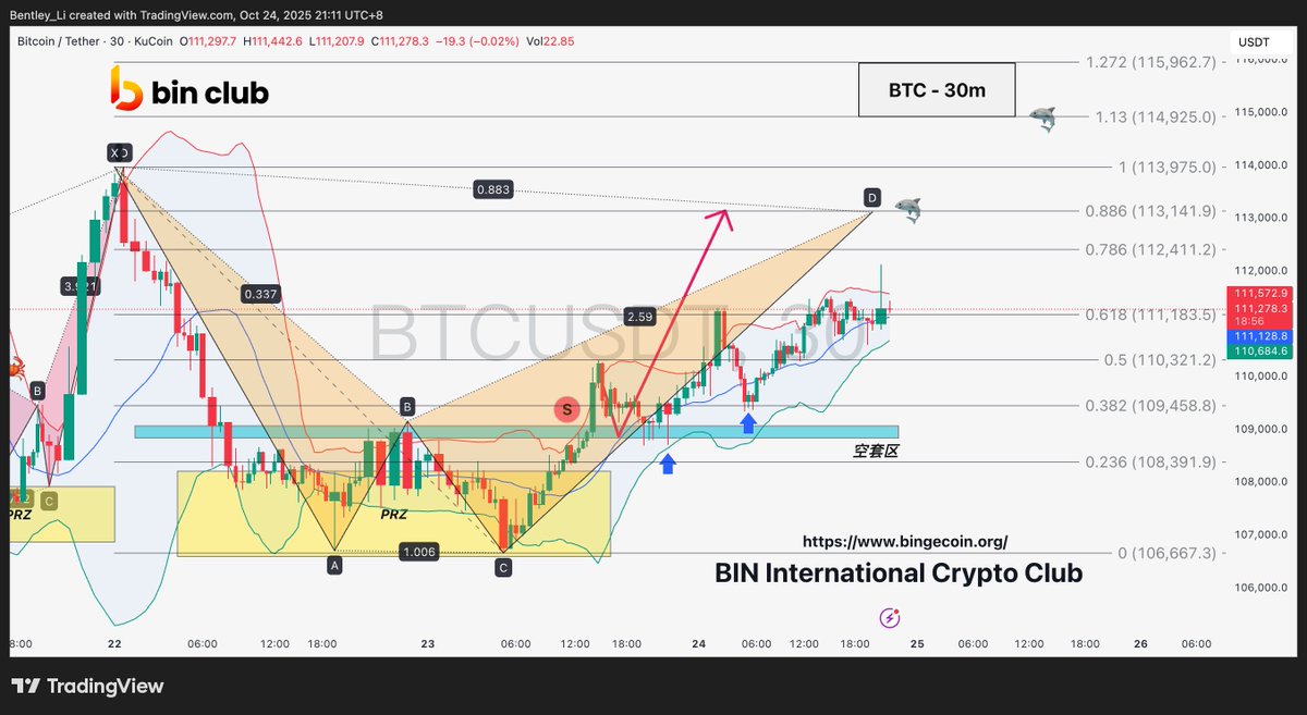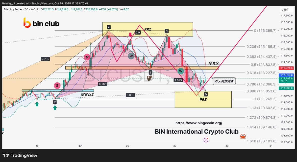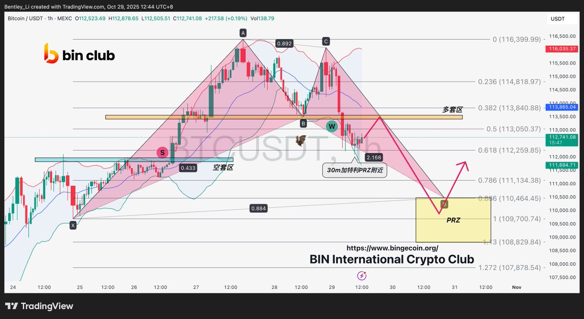 #BTC 饼子基本如预期,双顶后回调,只不过二顶略低一点,打到了30m布林上轨附近;目前重点关注空套区3的支撑,113500跌破的话谐波成立,可以考虑反抽试空,具体策略欢迎来社区参看(尤其是止损位置,不方便公开) 🧧 BIN哥铁粉可以三连后,直接点击链接进社区(限时发放):