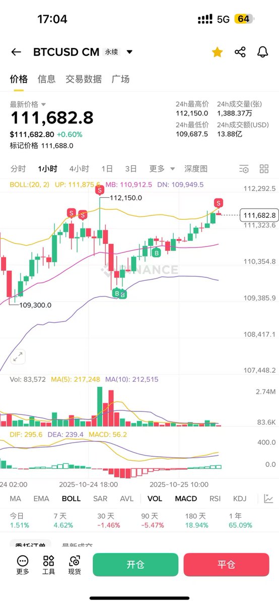 #BTC 大饼加更,基本如预期的先拉后砸再拉的节奏,目前再次测试1h布林上轨,我考虑走20%,测试113-115k,考虑总共再走30%,留一半格局下,一半做波段,有跟上吃肉的点赞回复1支持下,希望老铁们都能稳稳的盈利哈