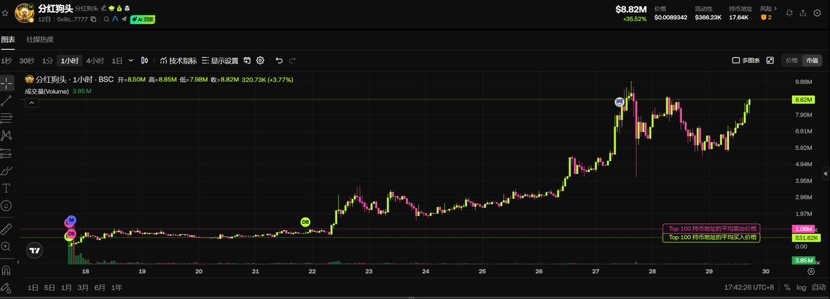 #分红狗头 摸过千万后洗盘两天,现回落8M。问我下车没?这种维密超模级的K线,我必须稳住。千万市值是道坎,洗掉浮筹才好起飞。