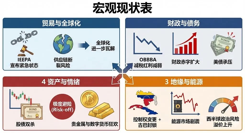 由于频繁动用 IEEPA 紧急状态导致的全球供应链风险,全球化正在进一步瓦解。超级法案 OBBBA 带来的减税红利减弱,政府财政赤字扩大,美债承压。地缘政治上,委内瑞拉控制权变更+古巴封锁,导致能源市场剧震。西半球地缘政治风险溢价上升,避险情绪随之升温,带动了黄金和白银的上涨,投资者极端避险。