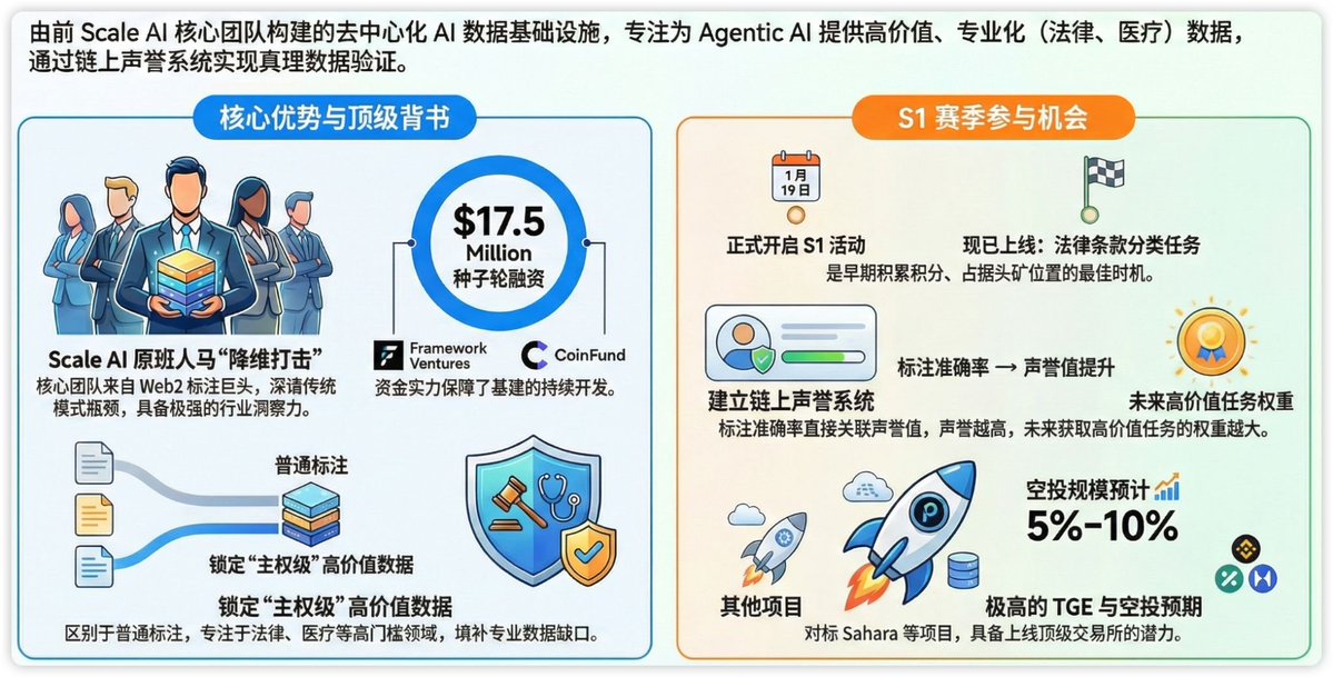 Perle Labs @PerleLabs 的出现正好踩在了这个点上,做 AI 数据标注的项目挺多,但从全球最大的数据标注独角兽 Scale AI 出来做的确实不一样 , Meta 收购它的时候估值都快 300 亿美金了 。他们最清楚在这个代理式 AI 时代,那种由各行业专家验证过的真理级数据有多贵。最近他们拿到了 Framework Ventures 和 CoinFund 领投的 1750 万美元,目的就是要在区块链上盖一座去中心化的数据基建。