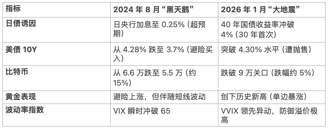 这两次暴跌虽然都和日元套利平仓有关,但底层逻辑不一样,2024 年 8 月那时候是因为日央行加息导致杠杆玩家被强平了,大家虽然在抛售,但心里还觉得美债是安全的,所以资金都往美债里躲,收益率是往下掉的。