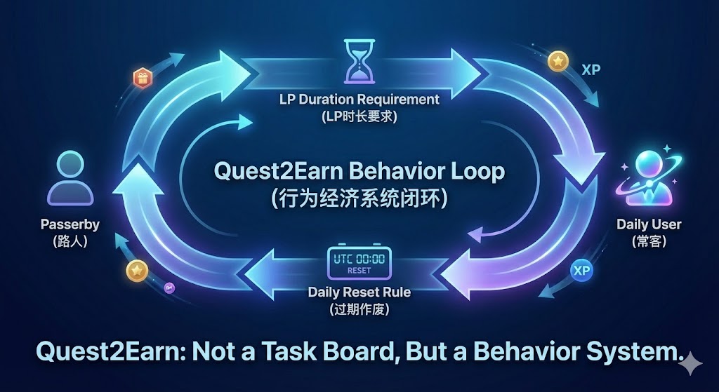 Quest2Earn 在这里更像胶水,它不是简单的任务板,而是一套行为经济系统,用规则把路过的人训练成每天回来的人。