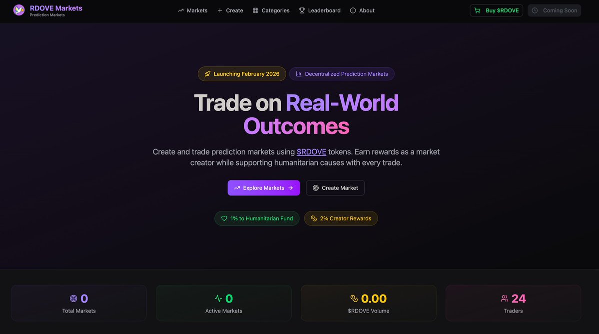 Create and trade prediction markets using $RDOVE tokens. Earn rewards as a market creator while supporting humanitarian causes with every trade. Again, onchain, so fully transparent.