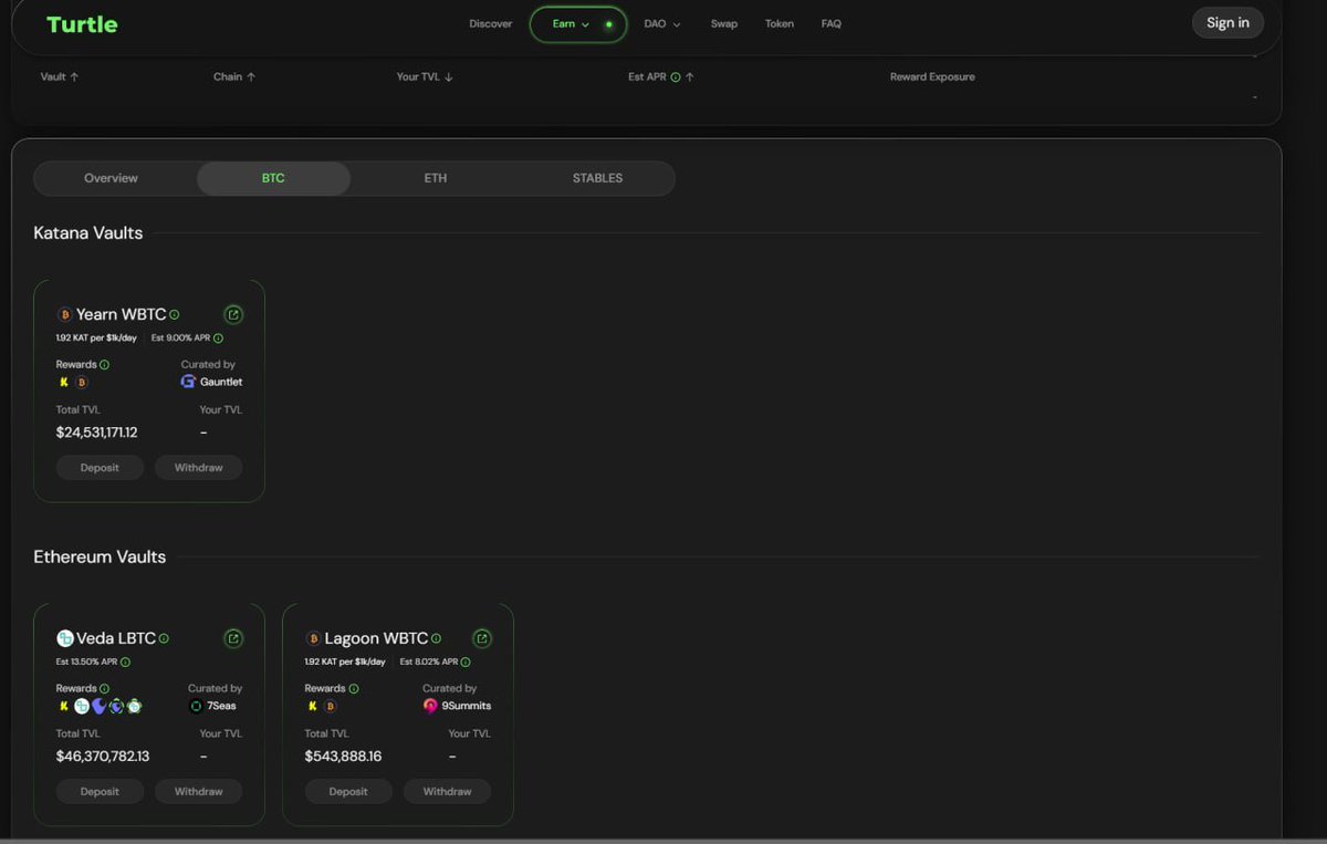 目前可以在 @turtledotxyz  里 @katana dapp中存款,年化13.5% ,作为币本位的理财年化还是非常可观的,总TVL高达$46M
