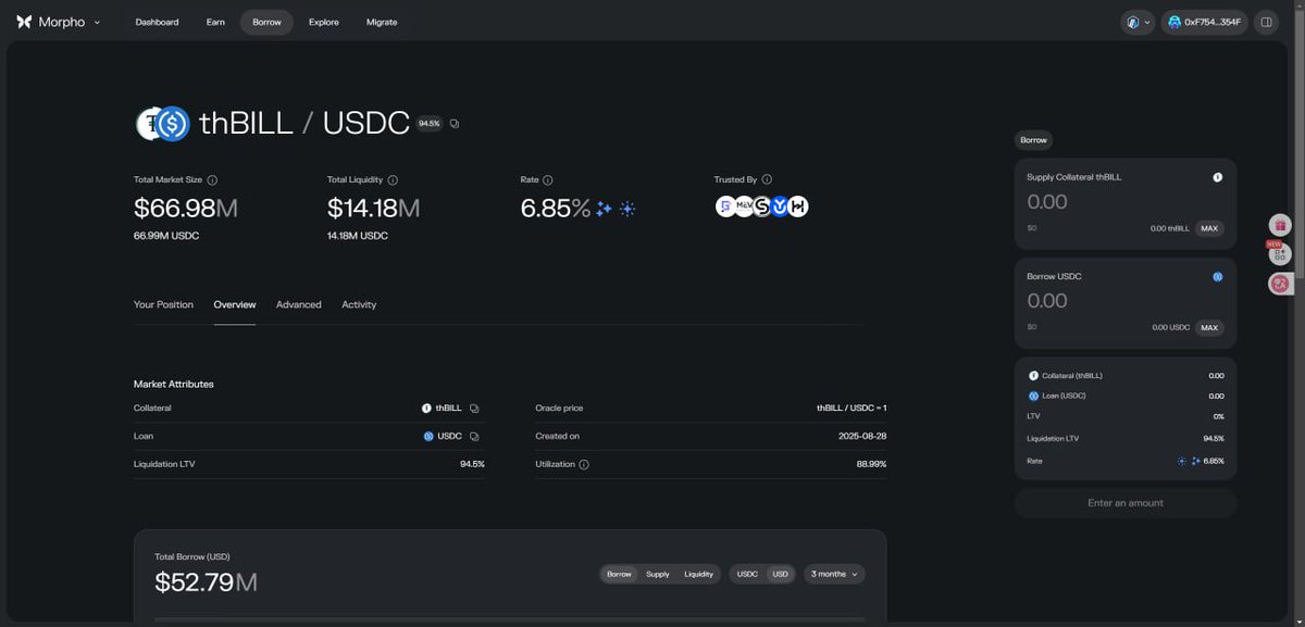在 @MorphoLabs 可以质押thbill或者pt-thbill借出USDC