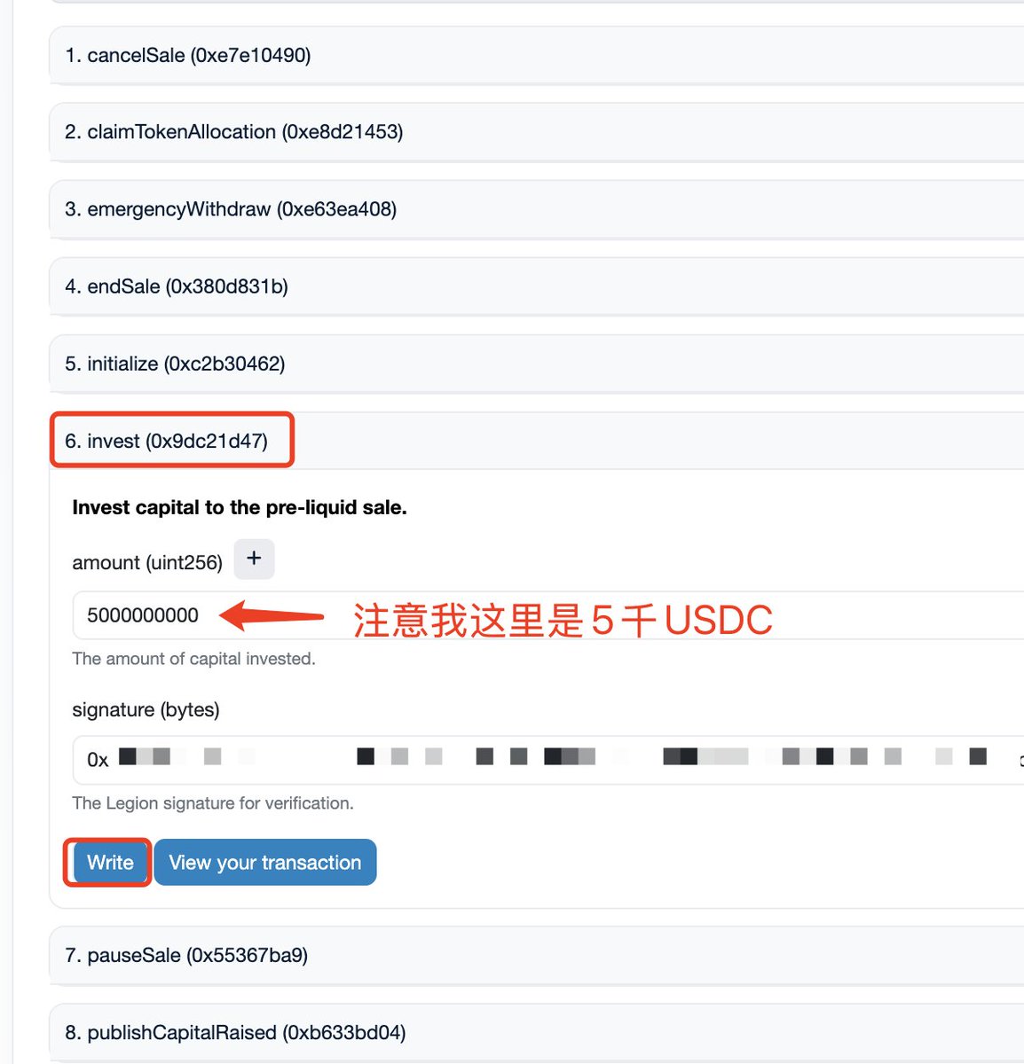 Legion 是不是一直不能Approve授权, 不能Deposit存入? 怎么高效的塞钱进去, 会技术的试试我这个办法: 1⃣ 授权: 1.1 - 用你绑定的钱包访问 https://t.co/dJOU3NSM0h 1.2 - 切到ETH链 代币填 0xA0b86991c6218b36c1d19D4a2e9Eb0cE3606eB48 合约地址填 0x28bE6260DBB7872DE5EFfC9a4A73c85b7405a8C0 1.3 - 数量填你在页面上选好的USDC数量, 点授权按钮付gas就可以了 2⃣Deposit存入: 2.1 - F12 打开调试模式看网络请求,找到一个 signature 的请求,复制signature那一长串(图1) 2.2 - 打开ethscan合约 https://t.co/TKNVHsAGXL 连接上钱包 2.3 - Invest 方法, amount 填金额(注意这里金额是uint256格式, 就是1000的话你需要填1000000000)signature 填上一步复制的那串(图2) 2.4 点 Write 弹出钱包如果不报错的话, 付gas应该就行了 ⚠️这个贴是给懂点技术的人参考的, 看不懂的请老实在官方页面上刷新多试, 操作错误造成的损失自行负责。