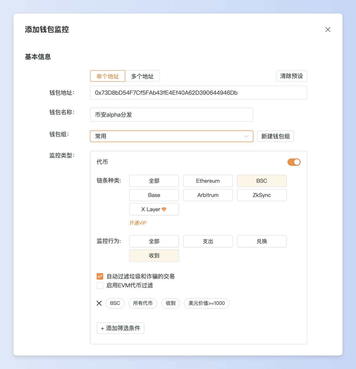 玩alpha的, 希望你们都把这个地址监控起来: 0x73D8bD54F7Cf5FAb43fE4Ef40A62D390644946Db 这是币安alpha空投用的合约地址, 要上alpha的项目都会打币到这个合约 监控工具 https://t.co/o8ubfS4hga 里的 "EVM钱包监控" 模块 我是这么填的👇
