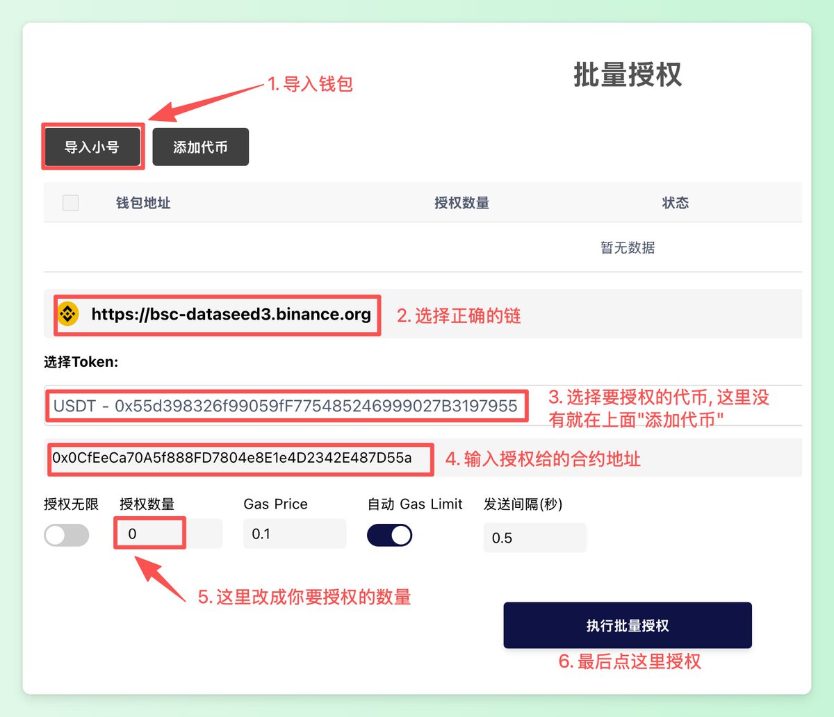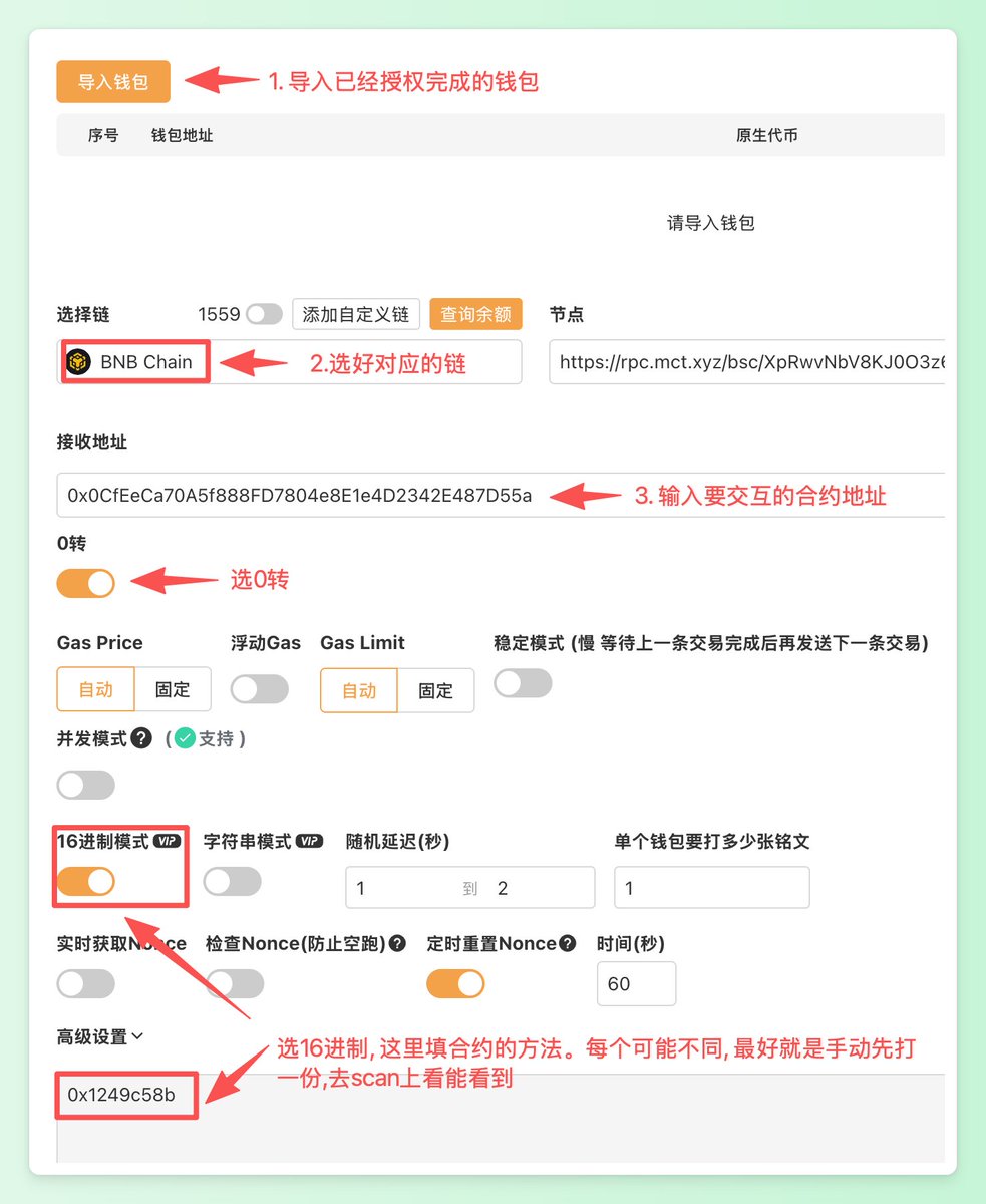 最近有 X402 协议相关的项目, 以刚刚BSC链的 Gold402 (GOLD) 为例, 发个类似项目批量打的通用教程: 它的要求是存 1USDT到合约 0x0cfeeca70a5f888fd7804e8e1e4d2342e487d55a 获得代币 需要用到两个工具: 批量授权 https://t.co/GeikPqpEpD 批量合约交互 https://t.co/hvaWJ5NuPx 1⃣ 首先准备好钱包, 把 USDT 和 GAS 转进去 2⃣ 用《批量授权》工具导入所有钱包私钥, 按下图1进行配置授权; 3⃣ 打开《批量合约交互》工具,按图2的方法配置; 4⃣先测试1-2个钱包没问题, 就可以大规模打了; 注意事项: 1. 批量合约交互工具用16进制是需要收费的 2. 每个合约方法可能不一样,具体项目具体分析 3. 链的gas有差异, 跑的时候注意修改 仅提供操作案例, DYOR!