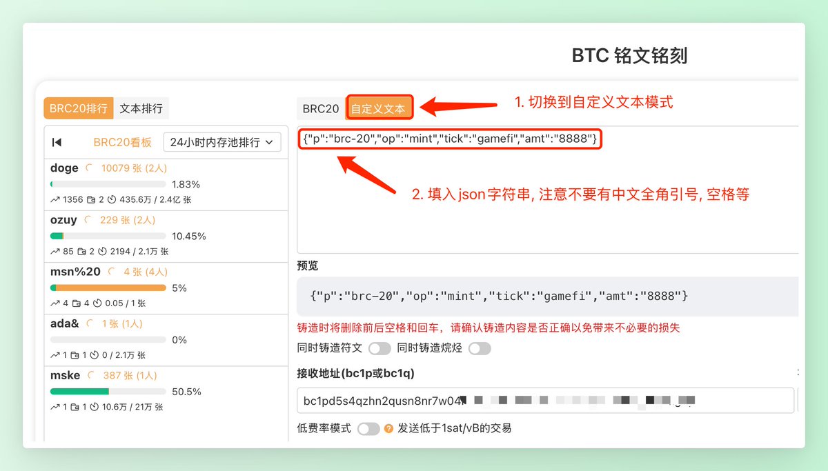 怎么打 BRC2.0 的铭文?拿 gamefi 举例 1⃣ 打开 https://t.co/2IfbxyGCtY 2⃣ 切换到 "自定义文本" 模式 3⃣ 输入json字符 {"p":"brc-20","op":"mint","tick":"gamefi","amt":"8888"} 4⃣ 设置矿工费, 其它配置和正常的铭文一样 支持 BRC2.0 新版本的内存池监控,也很快开发出来和大家见面了。