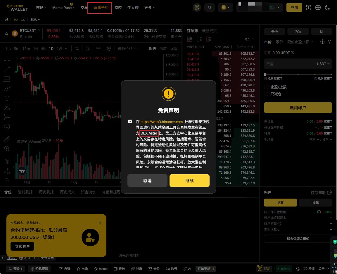 Binance Wallet 网页版点「永续合约」板块,可以看到直接深度集成的是 Aster 平台,这哈真可以说是BSC太子协议,对 @Aster_DEX 本身也会有很大的流量影响,相当于我们现在既可以在Binance交易所里开合约,也可以在币安钱包里用Aster开合约