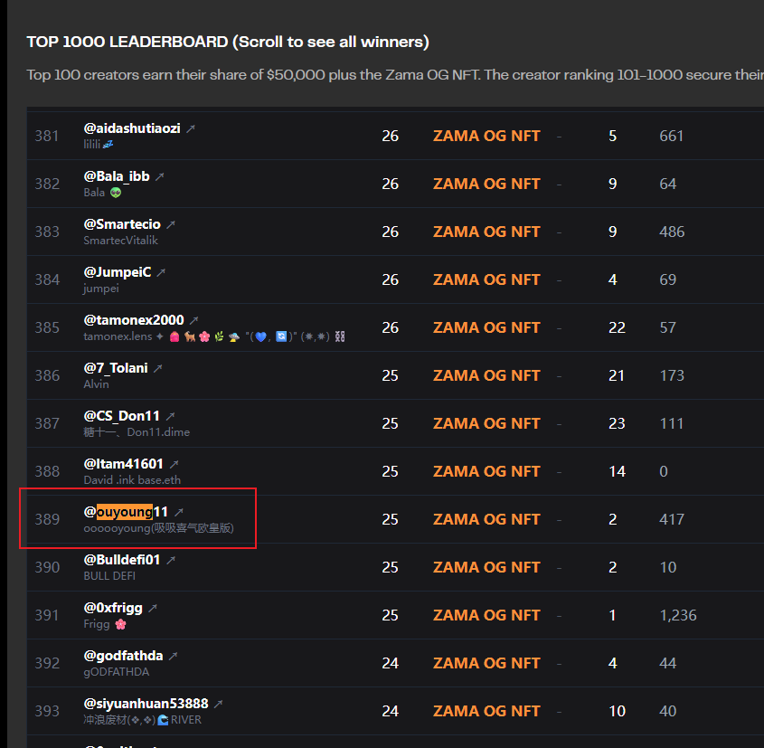 Zama 出榜单了,写了两篇还是拿到了 @zama 的 OG NFT 003,排名第389位