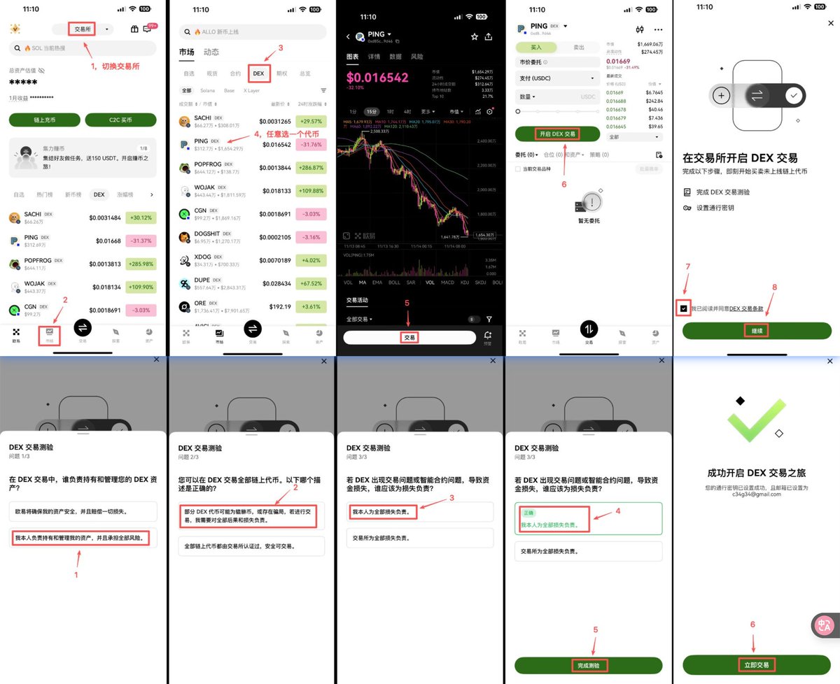 2️⃣ App内:底部市场 -> DEX -> 任意点进一个链上meme -> 开启DEX交易 -> 完成DEX测验