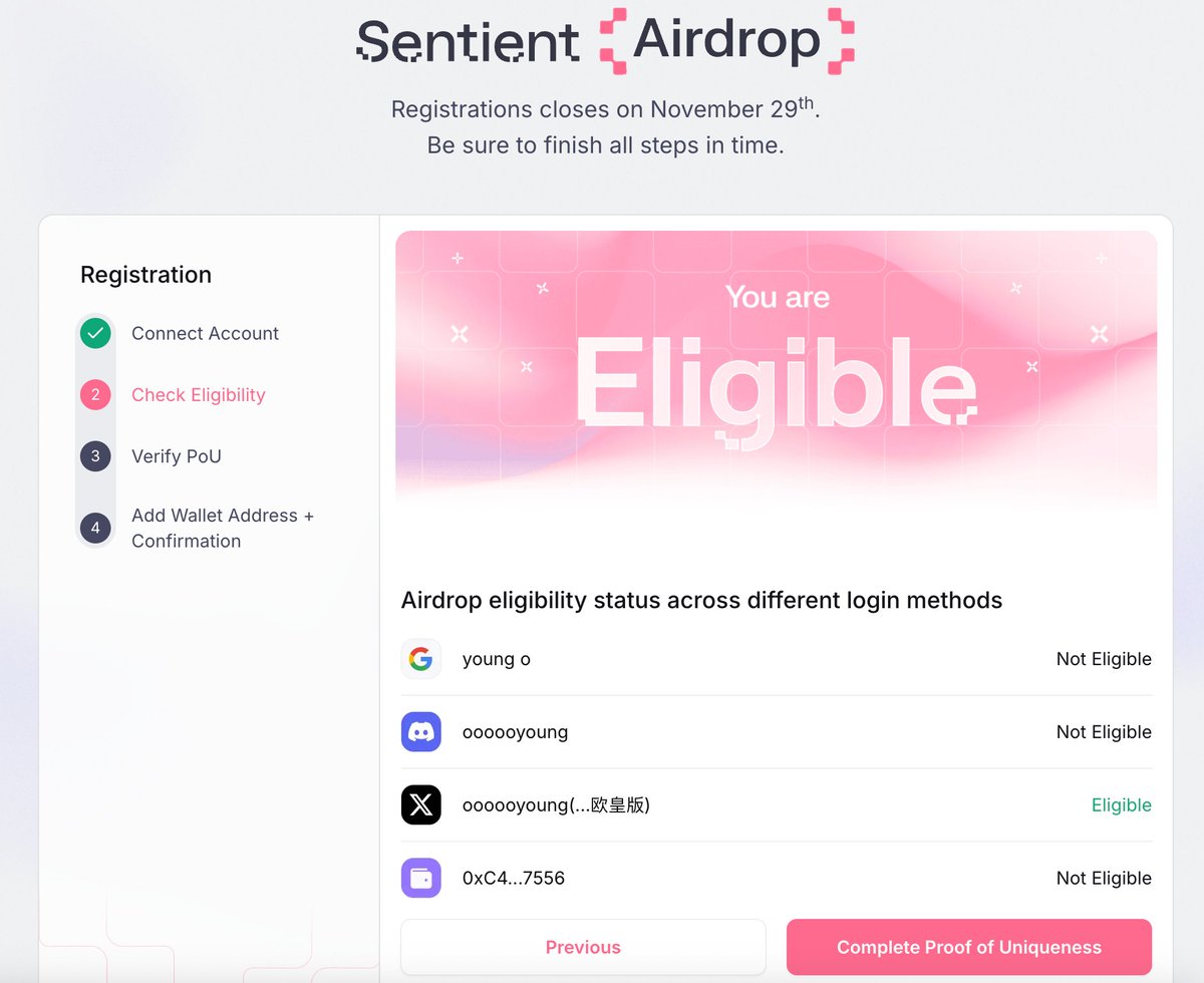 连接Google、Discord、X和钱包检查,目前 @SentientAGI 的 $SENT 盘前在0.06左右,嘴撸、角色、和活跃用户,需要在 11 月 29 号前完成空投注册!