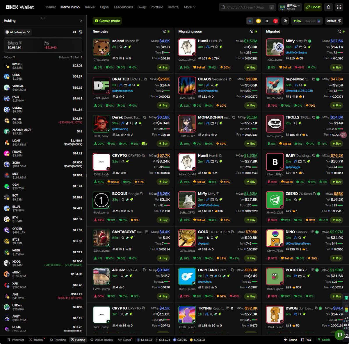 3️⃣ 目前支持 Solana/Base/X Layer/Bsc 这四个链的 meme 交易,无需跨链/提币/准备 GAS 等繁琐步骤