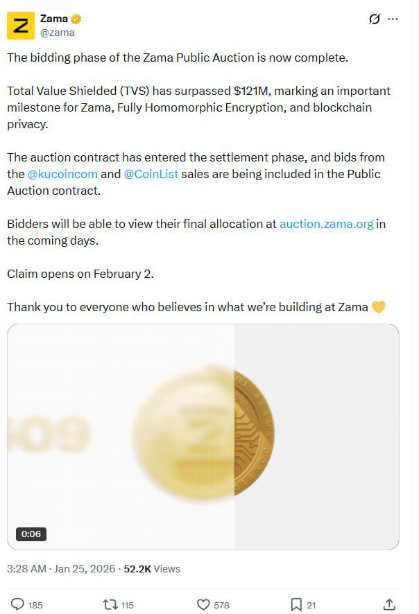 ZAMA 的公开拍卖(Public Sale)正式结束了,这轮拍卖总共筹集了 1.21亿美元。