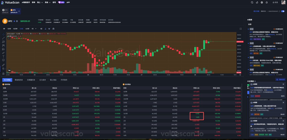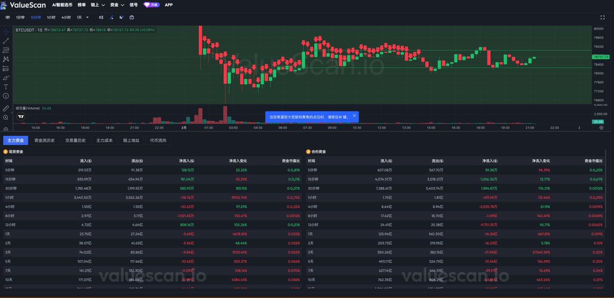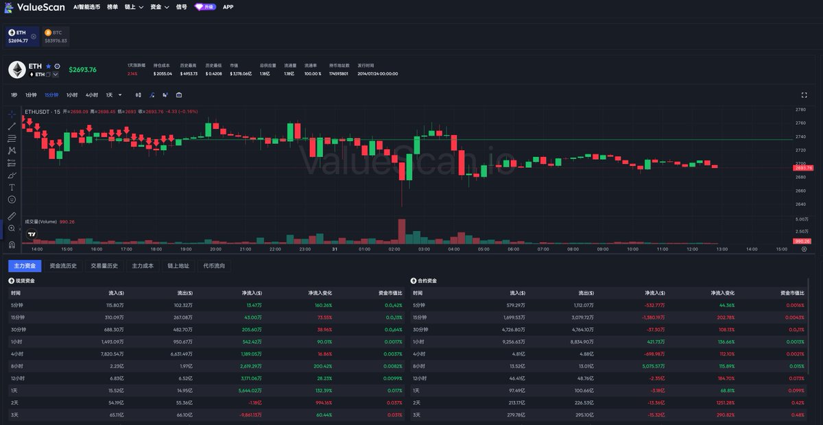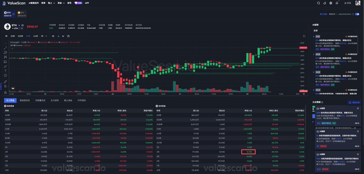 看来和上一次的拉升套路基本差不多. ETH先吸筹拉升,后面带动BTC上涨. 以太主力积累资金16亿了,可能会走一波小反弹行情,#valuescan 的资金监控提前知道主力动向.