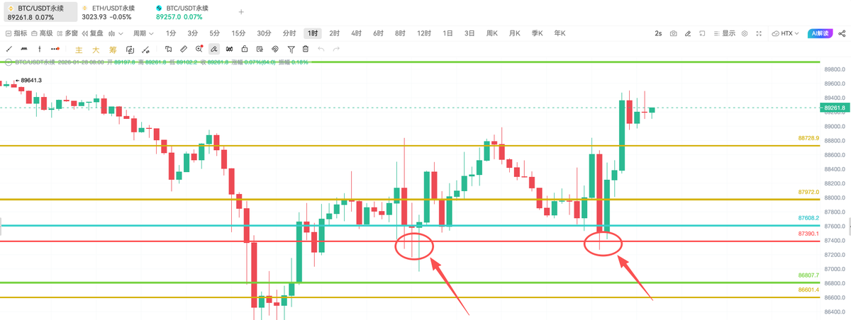 不过这种走势很难上车,因为都是v反的,而不是震荡一段时间,BTC走的标准有回踩关键位置,ETH太强势没有回踩.