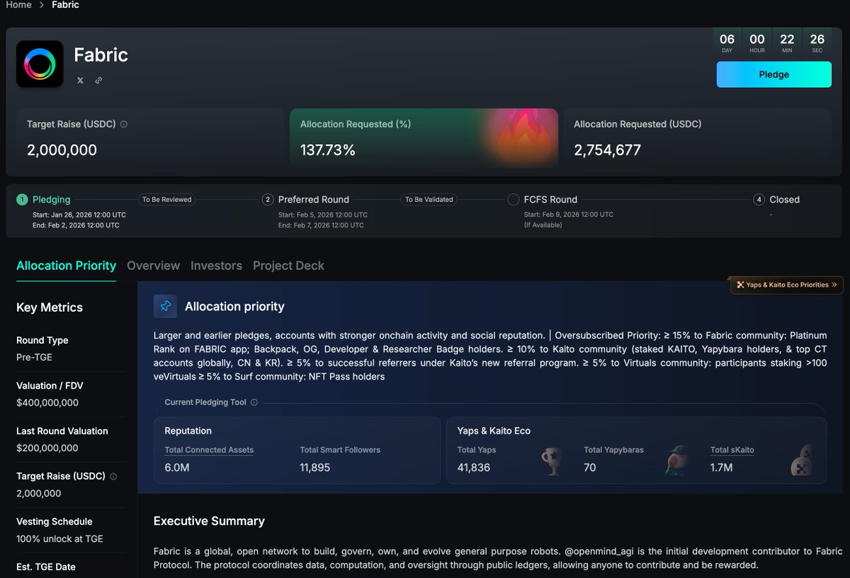@FabricFND 在kaito的打新,40%的代币会优先分配给 @KaitoAI @virtuals_io 和 @SurfAI 社区。
