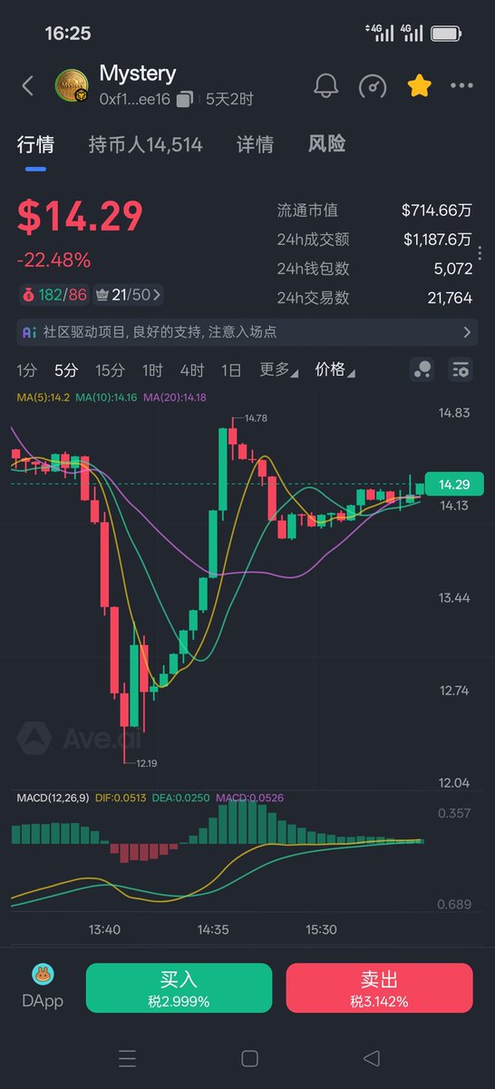 5.mystey模式币,持币生息,每天销毁,昨天下午6点过1u开盘,手速过慢,买在6u的价格,今天8点涨到20u,目前回落14u横盘调整中,纯属朋友喂饭,6点过开盘,朋友四点过就给了我地址。