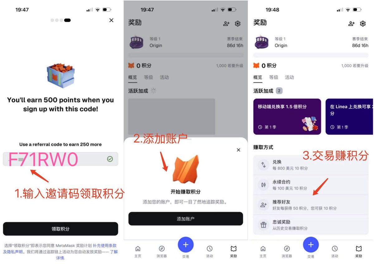天王级别的MetaMask要发空投了!!! 小狐狸钱包现在手机上免费领取500积分(相当于在钱包里50u的gas费) 就在刚刚,小狐狸上线了Metamask奖励计划👇 https://t.co/Ftlsup8WQp 邀请码:F71RW0(一定要填!!能助力你双倍领取 500 分积分!不输入邀请码就只有250积分。) 1️⃣ 下载或更新 MetaMask 最新的手机app 2️⃣ 在底部功能栏最右侧找到 “奖励” / “Rewards” 入口,点击进入 3️⃣ 点击 “领取两个 250 积分” / “Claim 250 points”,然后下一步,直到填入邀请码:F71RW0(❗️❗️❗️这一步骤至关重要,必须要完成该步骤,才视为开始参与积分活动,否则即使交易了也无法积累积分) 家人们,开干!!! #MetaMask #Linea