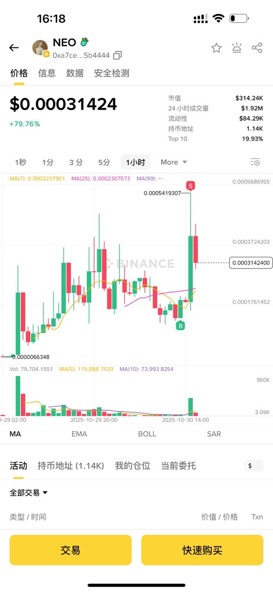 $NEO 已翻倍出本!剩下的继续格局!今天大热点 ca:0xa7cea5fa6527fde16bd768e358898a36cd5b4444