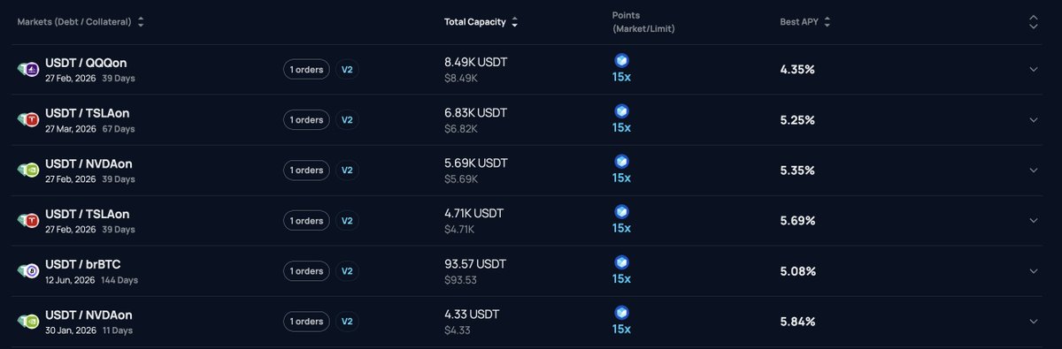 ✅确定的美股标的收益:用户通过存入 USDT,可以获得以 Nvidia (NVDAon)、Tesla (TSLAon) 或 QQQ (QQQon) 为抵押品的固定利率收益,其表现通常优于 Aave 的浮动利率