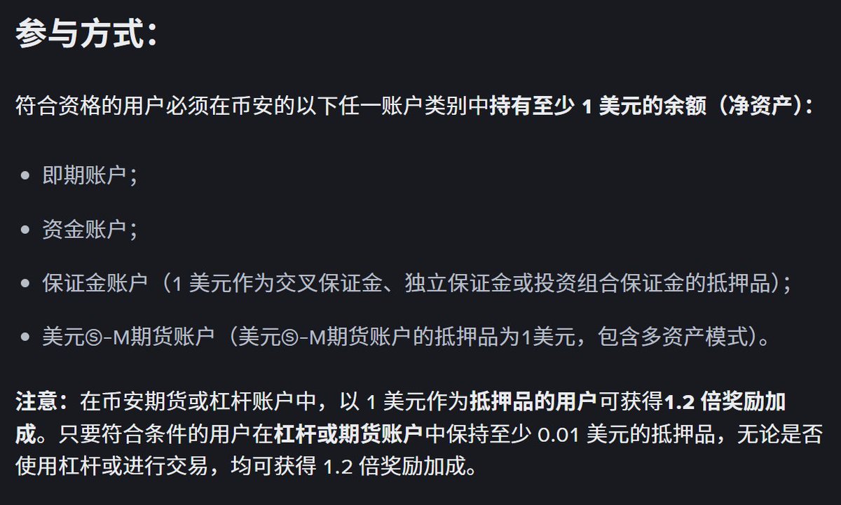 特别需要注意的是如果你将USD1放在杠杆或者合约账户里面,那么可以吃到1.2X的利息
