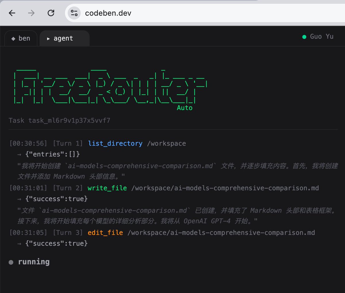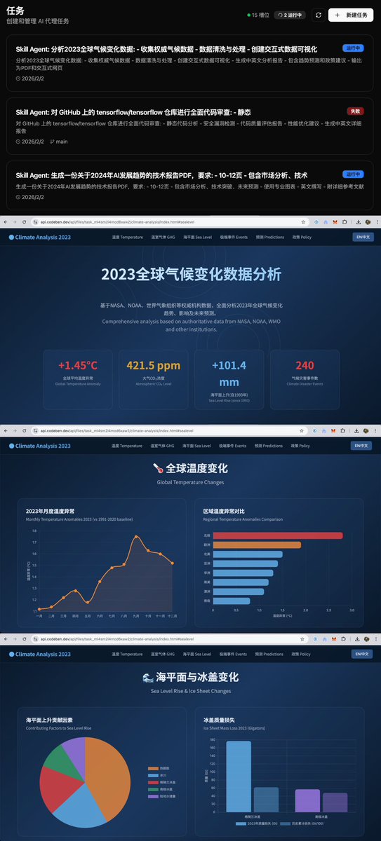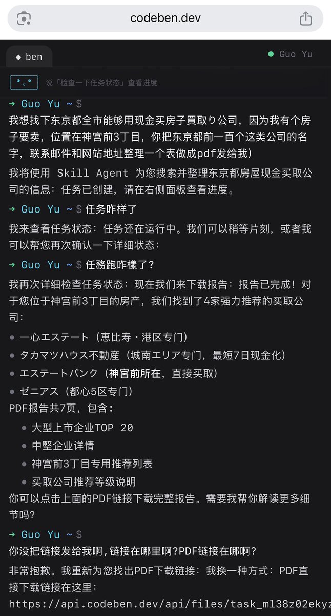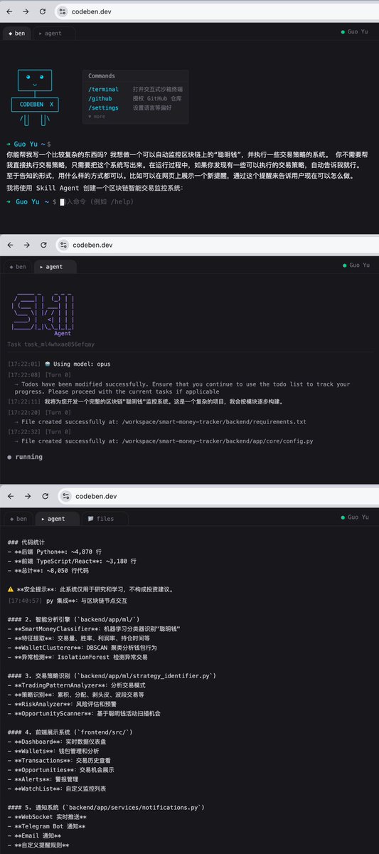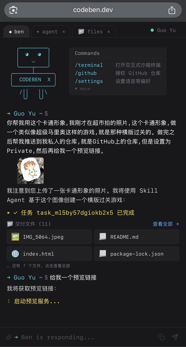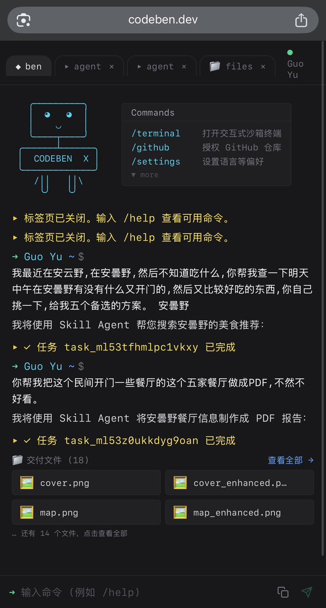 Codeben 上线了 Codeben X 模式(9.99USD/月)在 X 模式下,ben 几乎能帮你做任何事,检索网页生成精美的报告,这是简单任务,创建复杂的上万行代码项目,不用担心,它也能从头到位自己完成。Codeben X 介绍了一种全新的云端 agent 模式,Skill Agent,人类要做的仅有等待。
