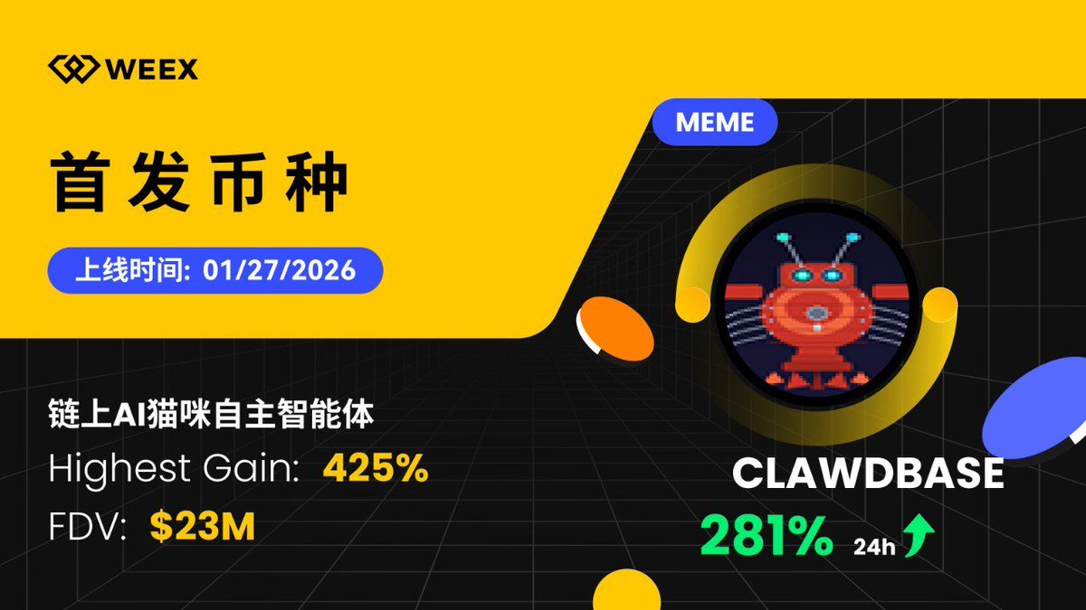 它家的MEME币 $CLAWDBASE 在WEEX全网首发之后,数据简直离谱!27号一上线直接起飞🛫,最高冲到4倍多,FDV怼到2300万美金,24小时暴涨281%…这可不是画大饼,是真金白银冲出来的行情!