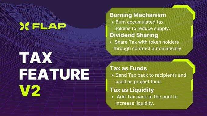 Flap的 Tax Token V2 机制设计得很精妙,税收不仅能自动回流去销毁代币,直接减少流通量,还能给持币人分红,或者给资金池加流动性。甚至还能作为项目资金返还给创建方。这种机制打开了很多可能性,不管是