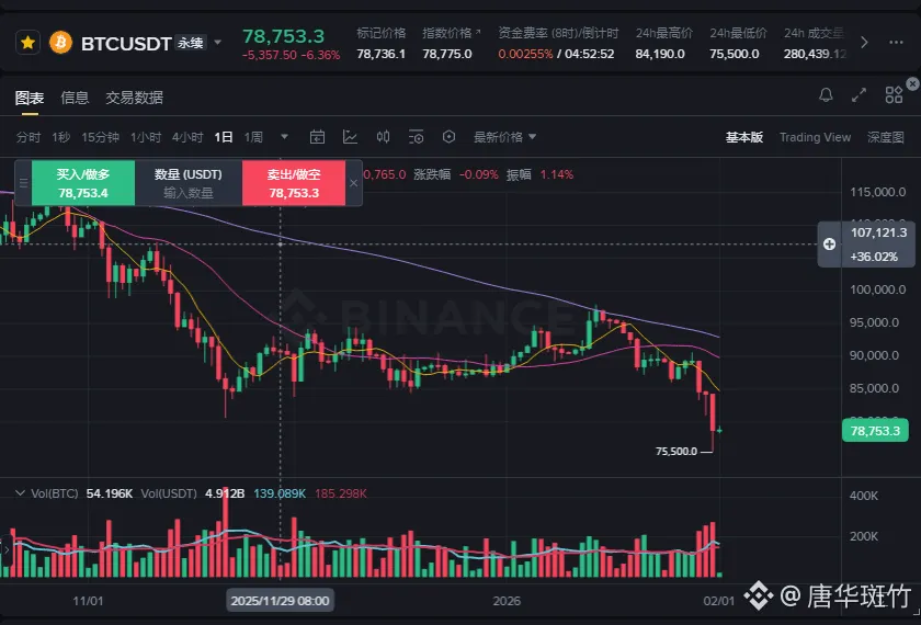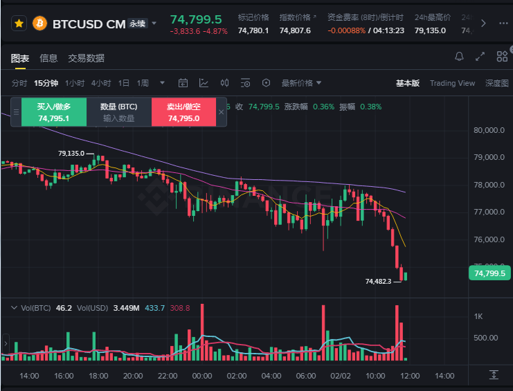 比特币价格失守8万美元重要关口,断崖式暴跌插针,几乎跌破75000关口!加密资产整体跌势加剧,其他主流代币跌幅更为显著:第二大数字货币以太坊跌幅超过10%,Solana下跌逾11%。