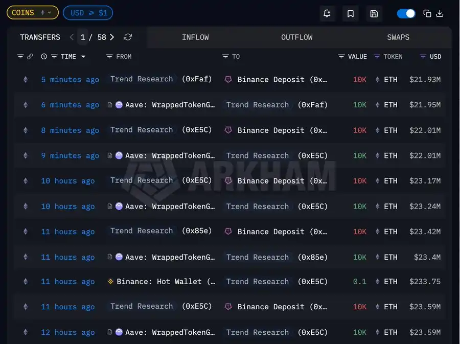 易理华旗下Trend Research持续止损减仓,24小时累计向CEX充值53,589枚ETH,过去 7 分钟 Trend Research 从 Binance 提出 3800 万枚 USDT ,随后充值进 Aave 偿还借款。