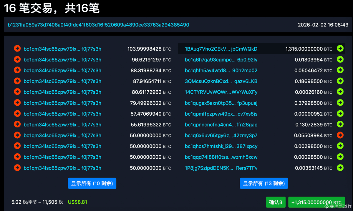 2月2日链上信息显示,币安相关比特币地址已经在北京时间 16:06 买入 1,315 枚比特币,价值约 1 亿美元。