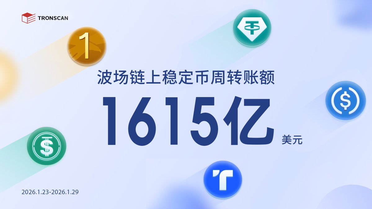 上周(1月23到29号)波场链上稳定币的转账额直接冲过了1615亿美元,单日最高的一天突破了290亿美元,其中TRC20-USDT占比超过99.2%。这个体量,在行业里绝对是数一数二了。