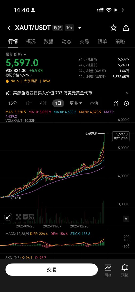 XAUT 24小时成交量是8亿美金–9亿美金左右。