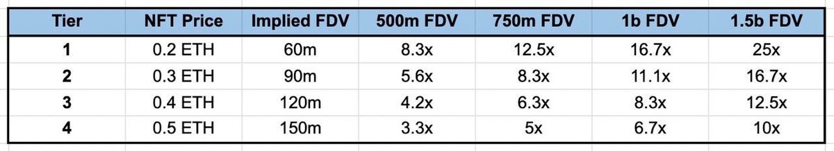 参考最新消息,他们即将发售代币捆绑型NFT,TGE时解锁50%,剩余50%分6个月线性释放,以下是海外社区统计的不同等级NFT对应的FDV和回报率,供参考⬇️