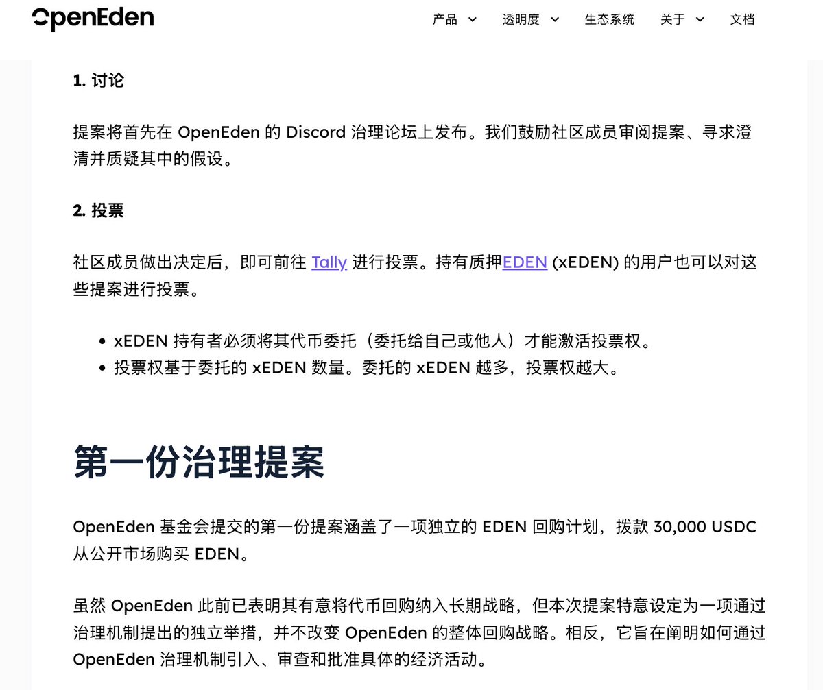 在治理初期,由OpenEden基金会主导,先在DC开放提案讨论,再放到Tally投票,后续会向社区开放提案提交,目前首个关于EDEN代币回购计划的提案正在DC讨论。