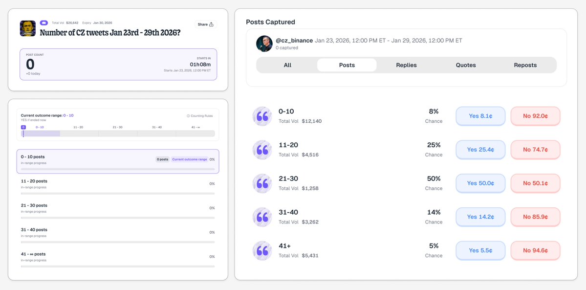 YZi Labs 投的预测市场 @predictdotfun 刚刚开了新的预测盘,预测 CZ 的发推次数,不得不说他们家的这个 UI 设计的挺好的,非常直观,还可以实时看到 CZ 目前的发推次数。