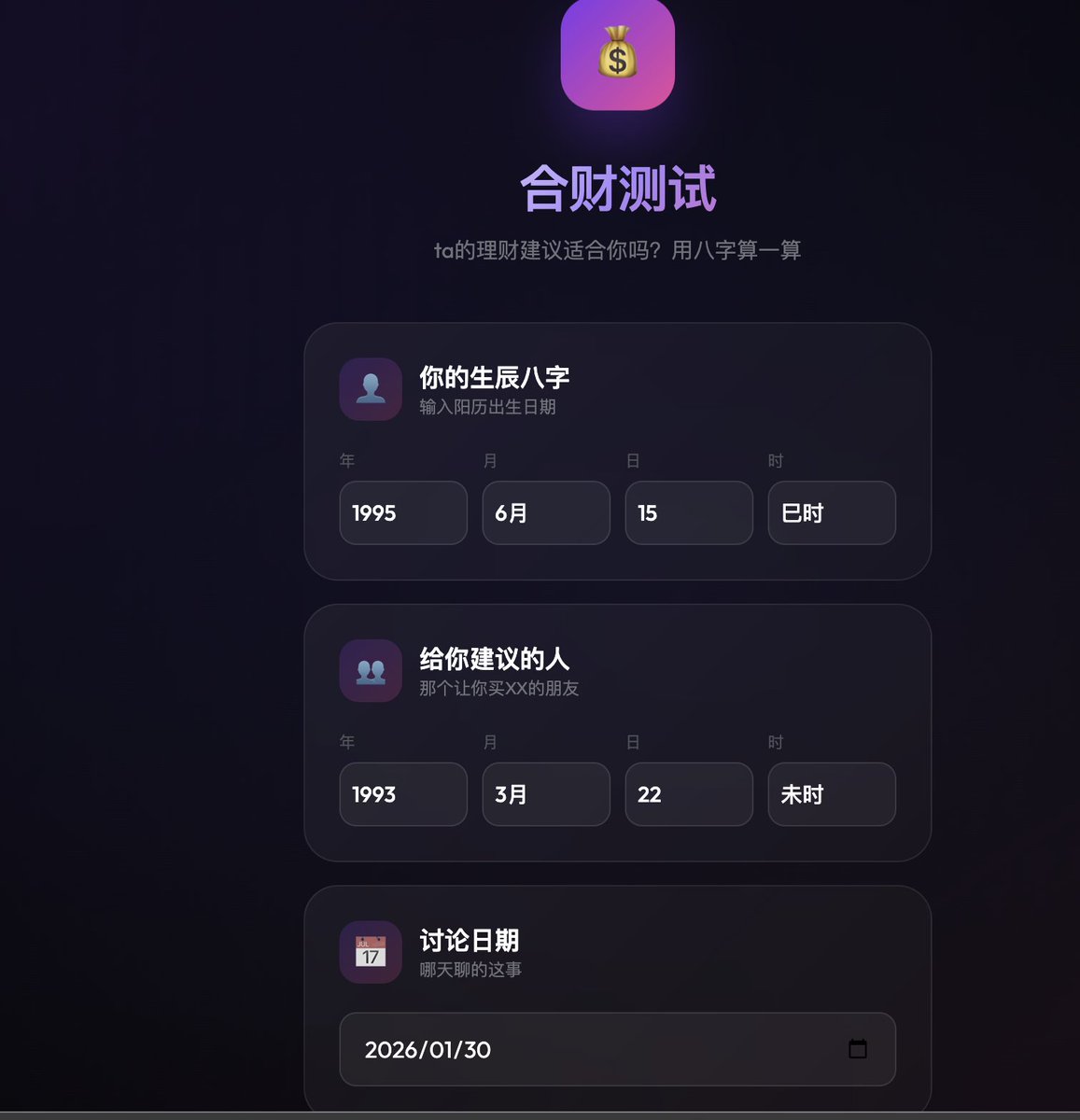 那么这个应用就可以解决这个问题:输入你和ta的生辰八字,选择讨论日期和投资标的,用命理算算你俩的财运是否同频。看看ta是你的财运贵人,还是带你踩坑的损友。