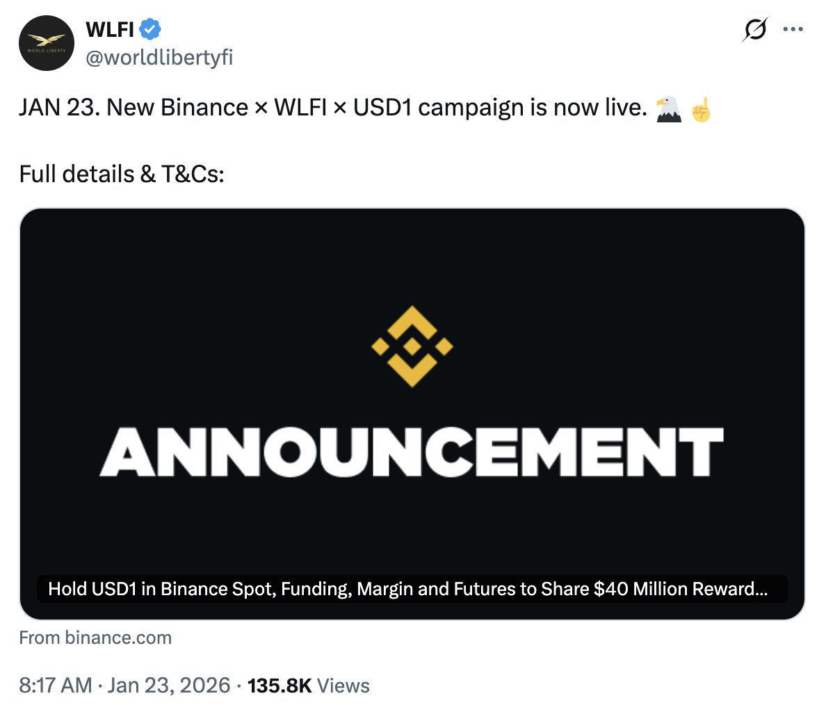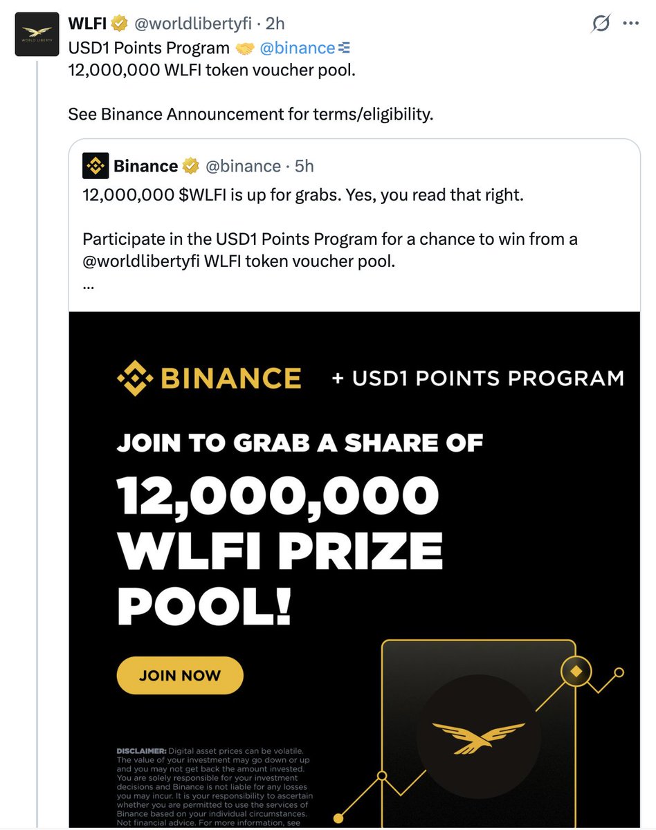 币安新一期的USD1 理财,1个月活动期瓜分4000万美元WLFI 代币: